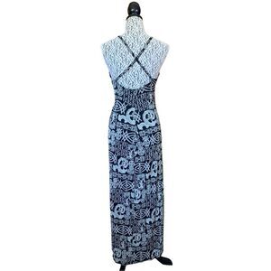 This dress is a black and white maxi dress with intricate Polynesian or tribal-inspired geometric and floral patterns.