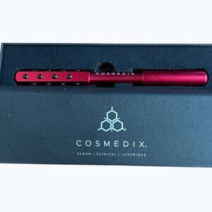 The Cosmedix Facial Massage Roller is designed to enhance skincare routines by improving texture, tone, and product absorption. Its sleek red finish adds elegance to its functionality, offering a gentle massage that reduces puffiness and promotes a sculpted complexion. This tool is crafted for those seeking a visibly smoother and radiant appearance.