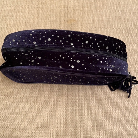 Navy blue velvet cosmetic bag; sparkling glitter detail