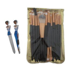 8 items: Cosmetic Bag, Compact Mirror, Nail File, Tweezers, Brushes, Key Chain & Ink Pen.
