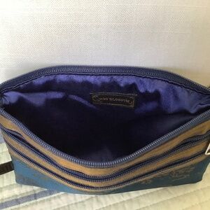 Miniature purse/cosmetic case/jewelry case with 3 zipper compartments. Silky blue liner fabric. 7 x 5.5 inches.