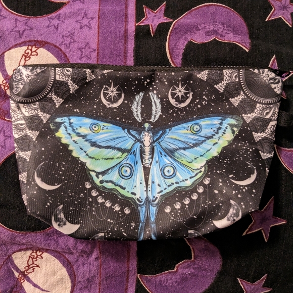 Beautiful satiny blue Luna moth zippered cosmetic pouch for makeup, travel, small items, etc.
