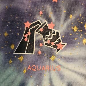 This tie-dye tee features a zodiac theme, with symbols representing each of the twelve astrological signs arranged in a grid pattern on the front.