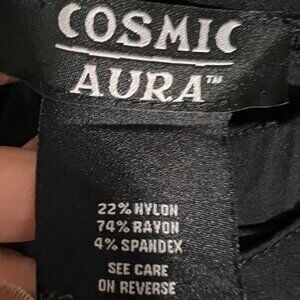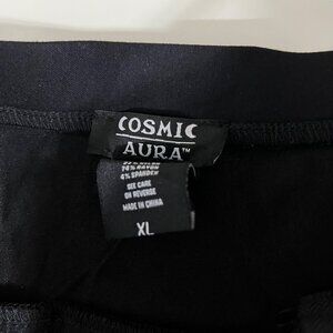 A versatile black skater mini skirt by Cosmic Aura, crafted from a nylon, rayon, and spandex blend. Features zipper and buckle detailing for a modern look.