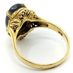 Mid-Century Elegance: Crafted in the late 20th century, this ring reflects the bold, colorful designs of the era. The ornate, vine-like prongs and detailed openwork in solid 18K yellow gold (hallmarked "K18") speak of bygone eras and hidden magic. The ring features decorative twisted wire, floral accents, and cut outs enhancing its vintage appeal.