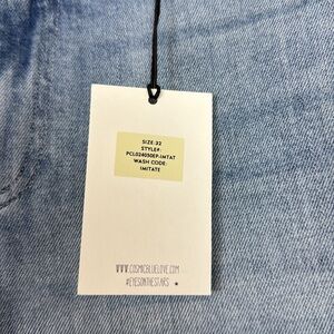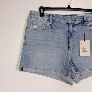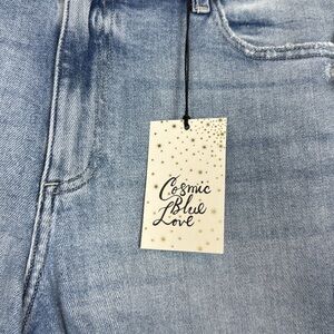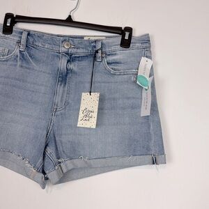 Cosmic Blue Love James High Rise Jean Shorts. Stitch Fix. Size 32 or 14. New with tags. A lighter wash. Cuffed hem. Minor factory distressing. Waist measures 34 inches. Rise 11 inches. Inseam 3.5 inches. Comes from a smoke free home.