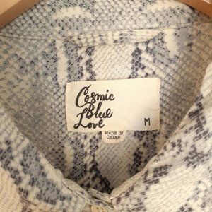 Very good pre-owned condition. Cosmic Blue Love Kyle Button Detail Top. Size Medium. 100% Rayon. Cream with gray snake print. Machine wash delicate. Popover style with roll tab sleeves. One chest pocket. Material is very soft and lightweight but has a nice weight to it.