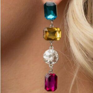 A strand of oversized round, teardrop, and emerald cut blue, yellow, white, and pink rhinestones trickles from the ear, creating a jaw-dropping chandelier. Earring attaches to a standard post earring.