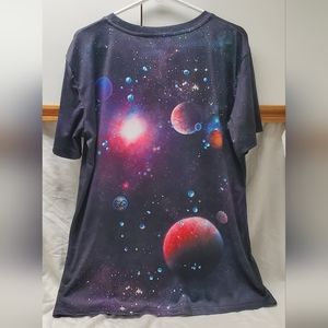 Cosmo kitty shirt men's size XL, but runs quite small. It's a semi stretchy, sateen type material.