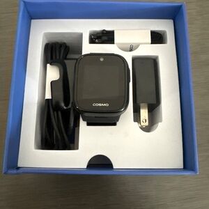 The COSMO Smartwatch is a sleek, modern wearable designed to keep you connected and informed throughout your day. It features a square color touchscreen display with a comfortable, adjustable black silicone band that’s both stylish and durable.