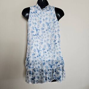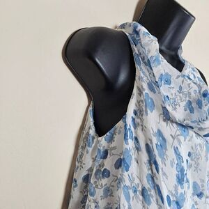 This is a sleeveless cowlneck style blouse by Cosmo. It features a sheer layer with blue and grey floral print over a solid white lining. This blouse was made in Italy. Though it is missing the materials tag, I believe it is silk.