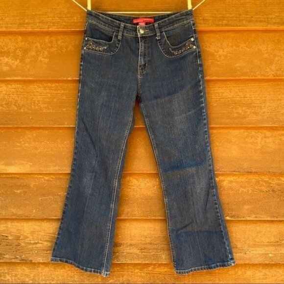 Previously loved but as you can see in the photos they are in great condition! Beautiful embroidery on front and back pockets! Flare bottom and Brass studs on front pockets. Dress them up or down! 55% Ramie 25.5% Cotton 18% Polyester 1.5% Spandex