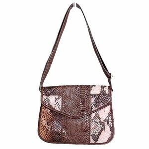 Cosmopolitan envelope bag, soft faux snakeskin with attached strap and magnetic flap closure. Exterior slip pocket under magnetic flap, two interior slip pockets, two large compartments and one zip pocket. Strap can be tucked inside bag to convert it to a clutch.