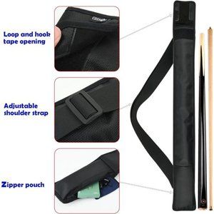 Collapsible Billiard Pool Cue Stick Carrying Case Bag Snooker Cue Stick Storage Pouch Holder, Holds 1/2 Cues (1 Butt / 1 Shaft) Feastures: - Holds 1/2 Billiard Cue Stick (1 Butt / 1 Shaft). Fits most 1/2 Billiard Cues (2-piece) measuring 58 inches or less. - Adjustable shoulder strap for convenient carrying. - Built-in elastic strap inside the bag for securing Butt and Shaft for better protection. - Built-in smaller zipper pouch for keeping billiard chalks, cue tip, etc. - ATTENTION: Case Bag ONLY, cue stick is NOT included.