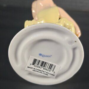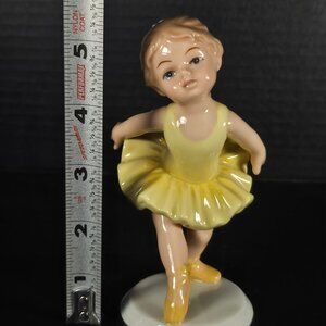 A fine porcelain and ceramic construction exquisitely detailed young ballerina girl in a yellow Tutu with hands back figurine. She has light brown hair and blue eyes, her ponytail hair accented with a delicate pink rose. On her feet are coordinating yellow ballet slippers, tied at her ankles with a bow. This item is made by Cosmos Gifts who manufacture the highest quality of fine porcelain and ceramic home and decor items. This exquisitely detailed item done in a high gloss finish makes a great gift or an excellent compliment to your decor. She is in mint condition and stands 5 inches high. Non smoking pet free home.