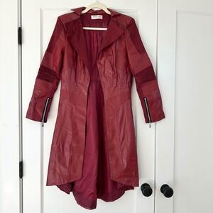 Keywords: Red Trench Coat, Faux Leather Coat, Cosplay Costume, Full Length Jacket, Womens Fashion Coat, Statement Outerwear, Zip Sleeve Jacket, Red Leather Look Coat, Costume Trench Coat, Cosplay FM, Medium Trench Coat, Red Jacket