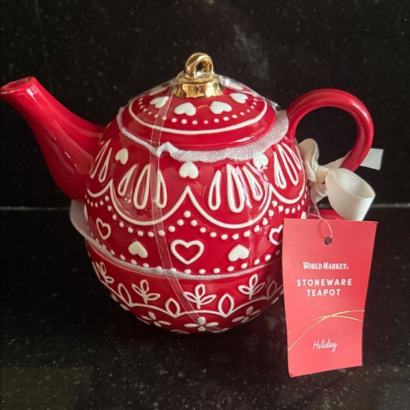 Charming red stoneware teapot with white holiday patterns. Features a gold-accented lid. Perfect for festive gatherings.