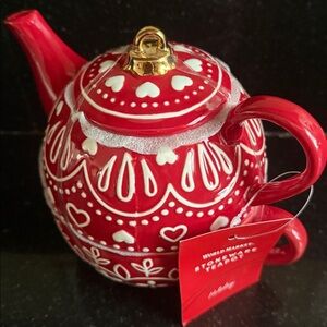 Cost Plus World Market Festive Red and White Stoneware Teapot with cup 2 in 1