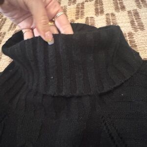 Chic black cowl neck sweater. Features ribbed texture and cozy fit. Ideal for layering.