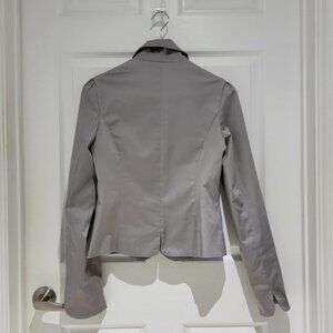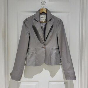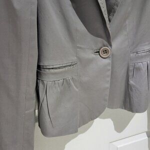 • Style: Lined, one button blazer with cute pleated shoulders and front pockets. Stitching detail along the collar.