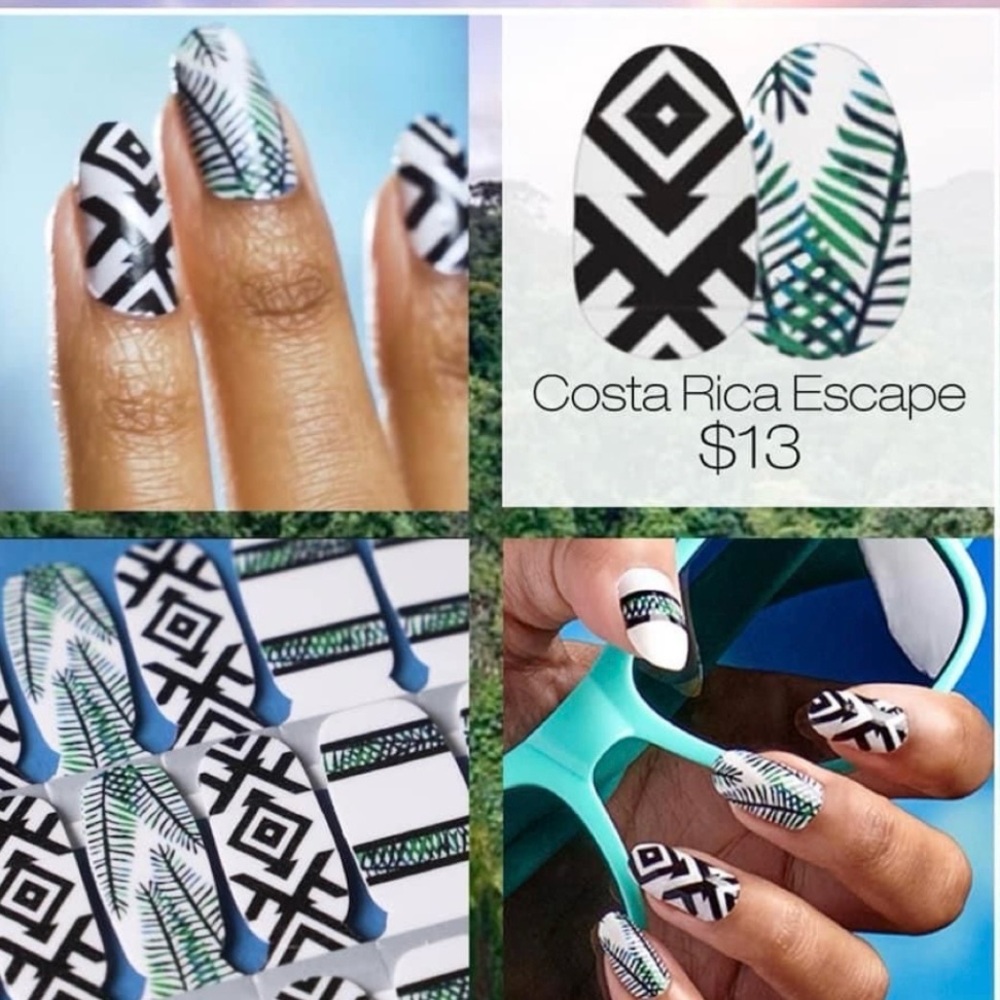 Bold black and white geometric patterns with green palm accents. Easy application. Long-lasting wear. I think these would be perfect for a trip to Africa!