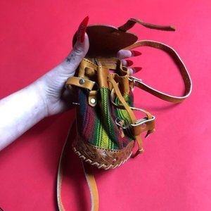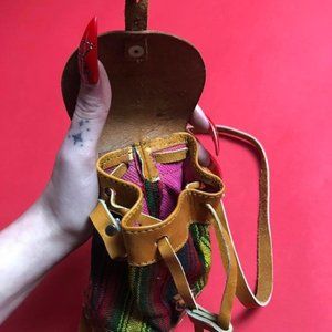 Super cute and practical little minibag, honestly looks like it would fit cans or bottles perfectly. Bottom is hard and the top and straps are made of leather, Rasta coloured part is similar to one of those stoner hoodies, possibly hemp.