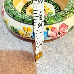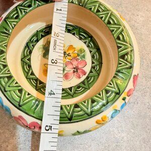 This vintage Costa Rican ceramic bowl showcases a hand-painted floral motif with vibrant colors complemented by intricate geometric designs. A charming decorative piece for collectors or enthusiasts of classic craftsmanship.