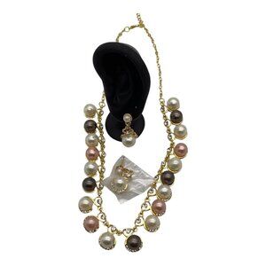 This elegant jewelry set features a gold-tone necklace and matching drop earrings. Accentuated with faux pearls in cream, pink, and brown tones for a sophisticated look.
