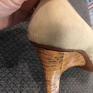 Natural colored suede and snake skin with cork heel wedges. There are no markings to indicate whether these are man made materials or not. Made in Italy. Size 39, equivalent to USA size 8. Suede is scuffed at right heel as shown in pictures.