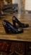 Black suede slip on high heels. Silver tone circular metal rivets. Square toe line with 4’ chunky stacked wooden heels. Leather lining and soles.