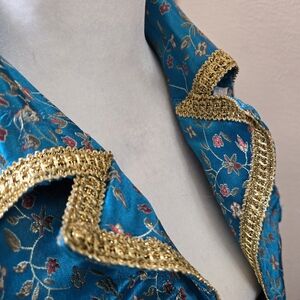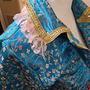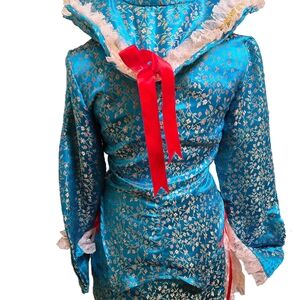 Elegant floral jacket featuring a vibrant blue base with striking red accents. the most adorable outfit I've ever had for Halloween custom made it's a vibrant blue with pink lace and red ribbons. Great quality fabric. Pink lace skirt underneath is separate this four-piece lace skirt, blue skirt and jacket and then hat to match. one of a kind.
