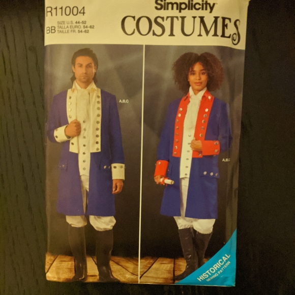 SIMPLICITY brand pattern to sew your own costume Jacket, Vest, and Pants reminiscent of "Hamilton" timeframe. Pattern never used or cut. Chest size 44-52".