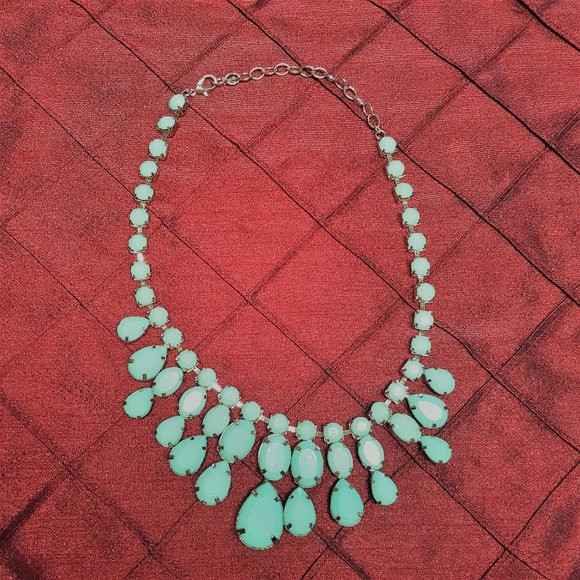 Vibrant light green stones adorn this lovely waterfall style necklace. Quality finishing on front and back with faceted stones securely attached. 8 inches from clasp to bottom stone. Picture doesn't do it justice! Great for casual or dressy attire!