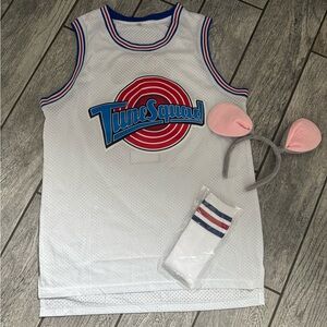 White basketball jersey featuring Tune Squad logo. Includes matching socks and pink ear headband.