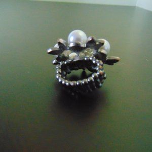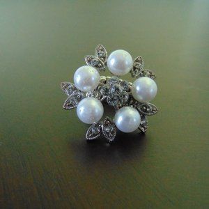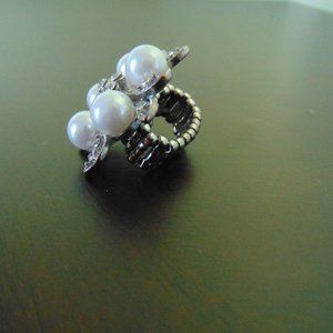 Elegant flower ring with blend of faux white-pearl style and clear beads. The ring shows some minor signs of wear, but all the beads are attached. It stretches up to size 8.5 and looks very beautiful on the finger.