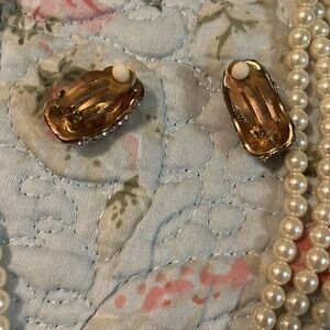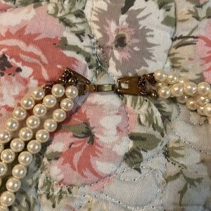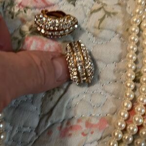 Beautiful three strand pearl necklace with diamond cluster in the middle diamond cluster earrings that are clip on I have pierced ears and I wore them. this is a beautiful set.