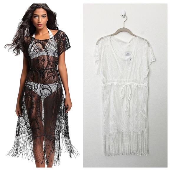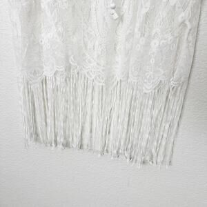 Costyleen Sz Medium M White Fringe Hem Scoop Neck Sheer Beach Swim Coverup NWT