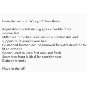 This is a pair of Cozyfeet comfort shoes flats Mary Jane style. Hook and loop closure for easy on and off. Koryl model. Women’s US Size 9. Diabetic friendly. Excellent condition.