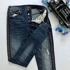 NWOT. Ankle Skinny Jeans for Juniors/Women Size 3/26. Buttons for closure, medium wash, rhinestones trim sides, 5 pockets design, has loops, distressed, mid rise. Please note, there are no size/material/care tags. I am approximating is a Size 3/26 based on measurements and marking it as such. Please see measurements for best sizing. Pictures are part of description.