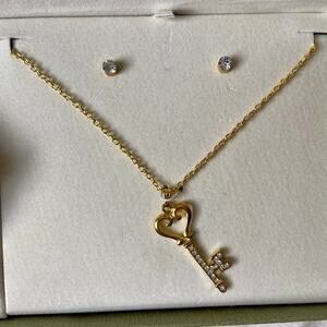 Gold watch, key necklace, and earrings set by Cote d’ Azur. Brand new. Box slightly damaged but all the jewelry is brand new.