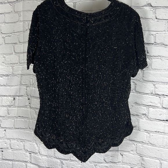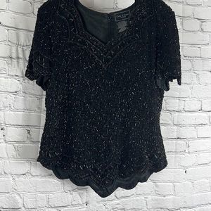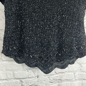 Cote d'Azur Top Evening Beaded Scallop Hem Short Sleeve Black Size Large