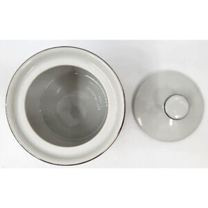 The Cotillion Eileen 3693 Sugar Bowl is a vintage collectible piece that embodies the style of the 1970s, featuring a floral silver trim design. Made in Japan during the 1970s, this ceramic sugar bowl has a glossy white finish with intricate detailing. With a height of 3 1/8 inches, this original piece is a charming addition to any kitchen or dining room, adding a touch of retro elegance to your table setting.