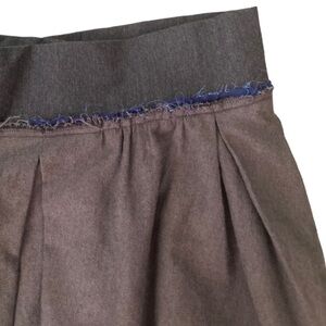 Cotélac Box Pleat A Line Skirt featuring exposed raw edge detailing, a back concealed zip with two button closure. Front pockets. A gorgeous neutral brown with grey undertones. Contrast raw edge in dark blue.