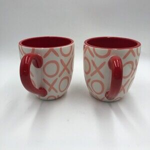 Coton Colors Oversized Ceramic Set of 2 Mugs by Laura Johnson Lipstick XOXO. Mugs are pre-owned. Please see all photos for visible condition. No original box. No noticeable chips/cracks. Look unused. Red white pink. Handled. Approximately 5.75 inches wide include handle x 4.25 inches tall.