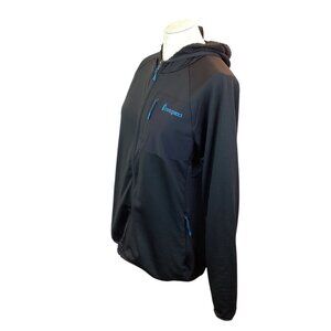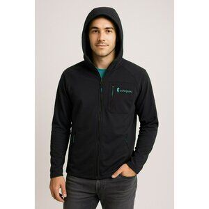 cotopaxi jacket, men's hooded jacket, black zip jacket, hiking jacket, lightweight hoodie, men's large jacket, casual outdoor wear, adventure clothing, warm hooded jacket, waffle texture jacket, outdoor layering piece, polyester spandex jacket, zippered pockets jacket