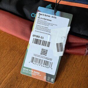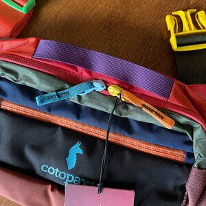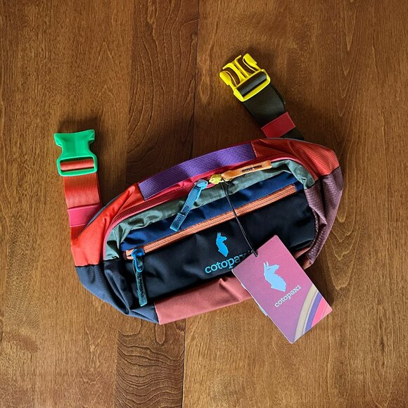 Cotopaxi Kapai 3L Hip Pack in Del Dia one-of-a-kind colorway. NWT, though please note there are some barcode stickers on the tag. Multicolor with red and black as prominent colors, also crimson, olive green, purple, navy blue, yellow, orange and green. Light blue brand logo on the front panel. Made with 100% deadstock nylon & polyester. This is the larger size, approximately 9 x 5.5 x 3 inches according to the brand's product description. The back is lightly padded and the interior includes a clip in the smaller pocket. Great style of belt bag since it can hold a lot, with gender-neutral sizing and colors.