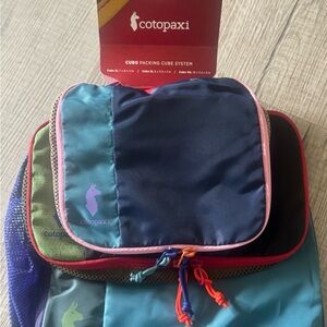 Vibrant Cotopaxi packing cubes. Ideal for organized travel. Features multiple colors and sizes.