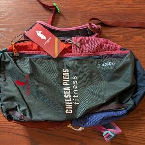 Cotopaxi backpack with vibrant multicolor design. Features include multiple compartments and adjustable straps.