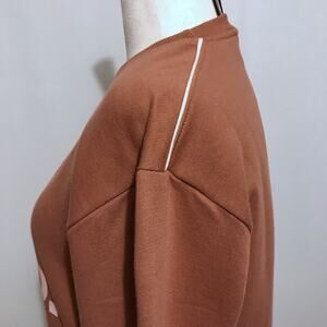 NWT. Fleece Lined Heather Rust color family Sweatshirt for Women Size M. Pullover, long sleeves, knit construction, crewneck, ribbed cuffs and bottom hem, ivory trim accent on shoulders, graphic "Do Good." front. Pictures are part of description.