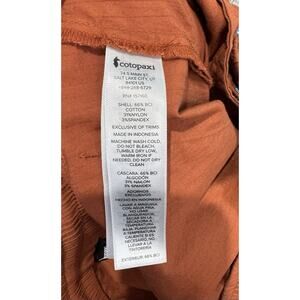 Stylish Cotopaxi chinos. Vibrant orange color. Features a blue drawstring. Comfortable fit.